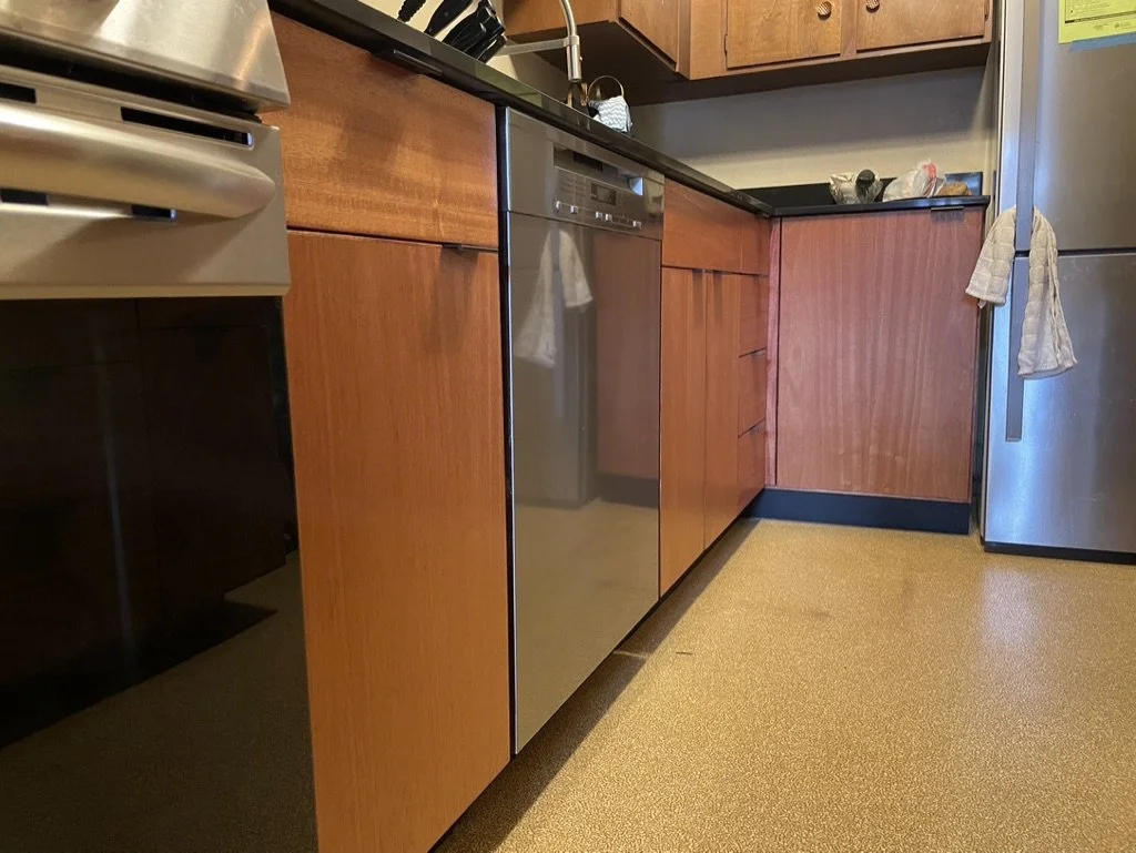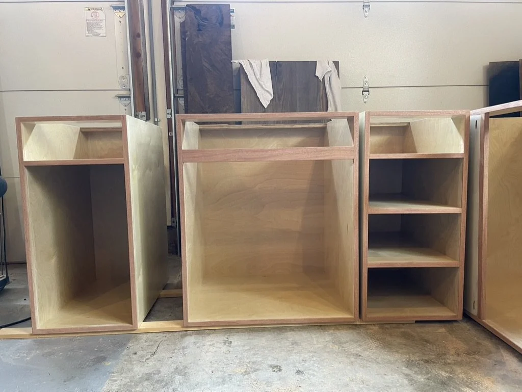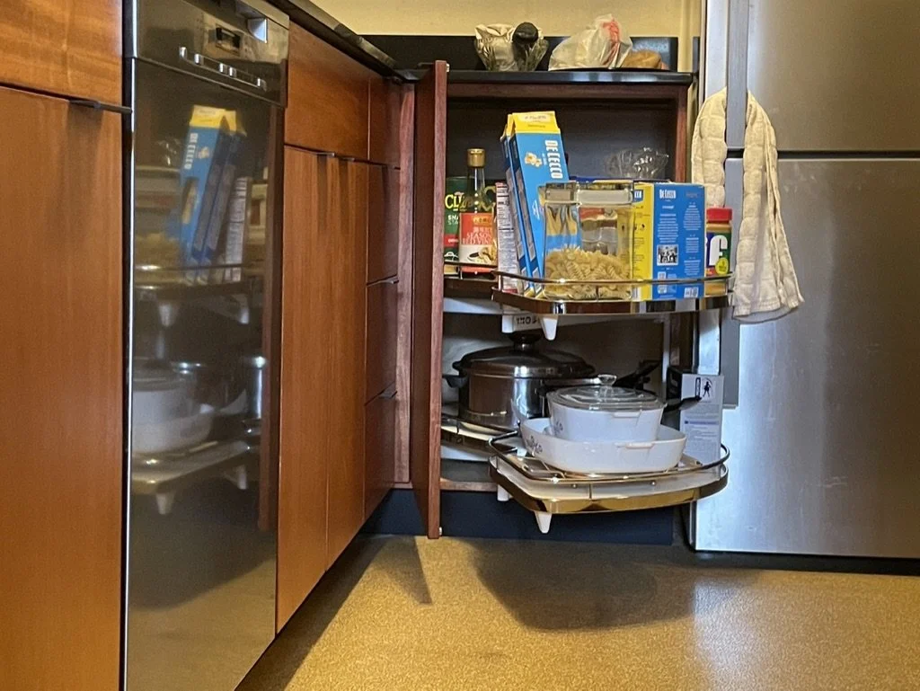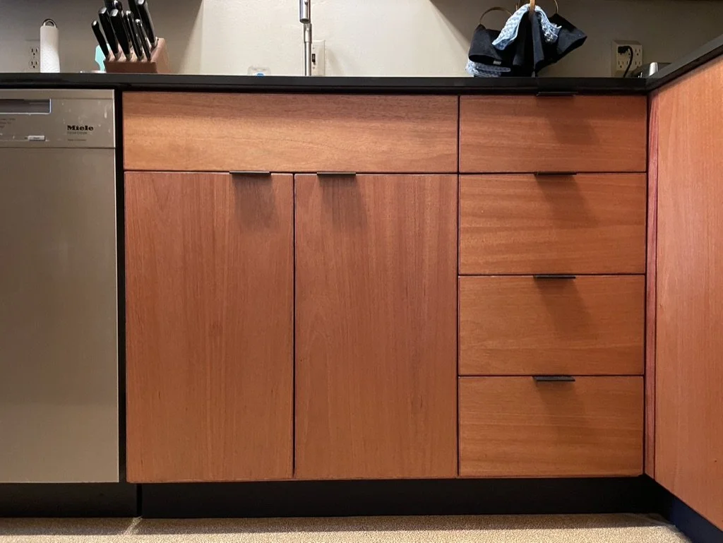 lower cabinets for a small kitchen in Capital Hill condominium made from khaya wood (African mahogany). corner cabinet has a pull out hardware for easy accessibility.