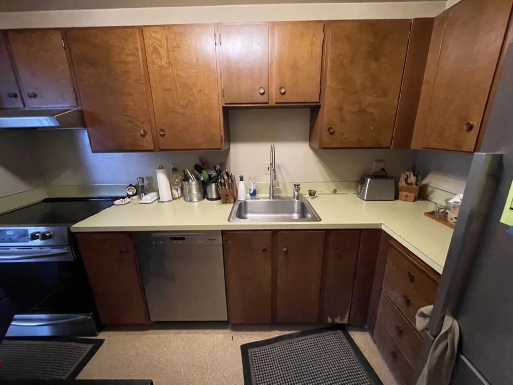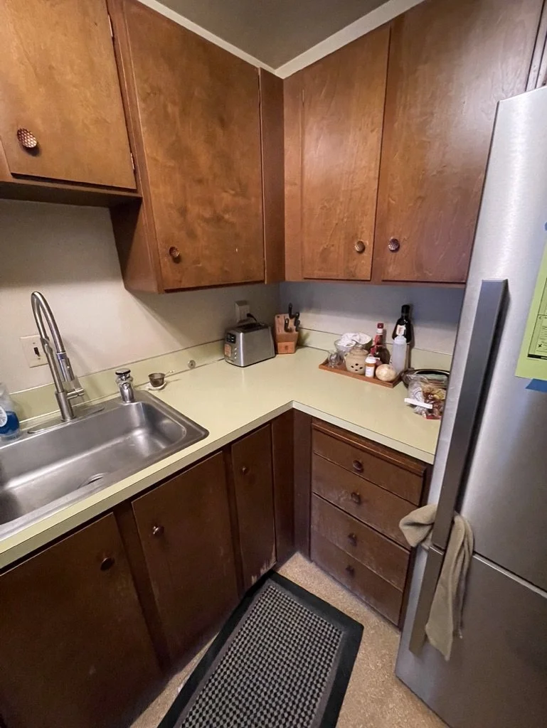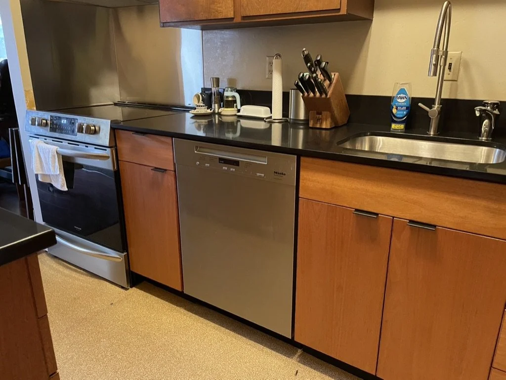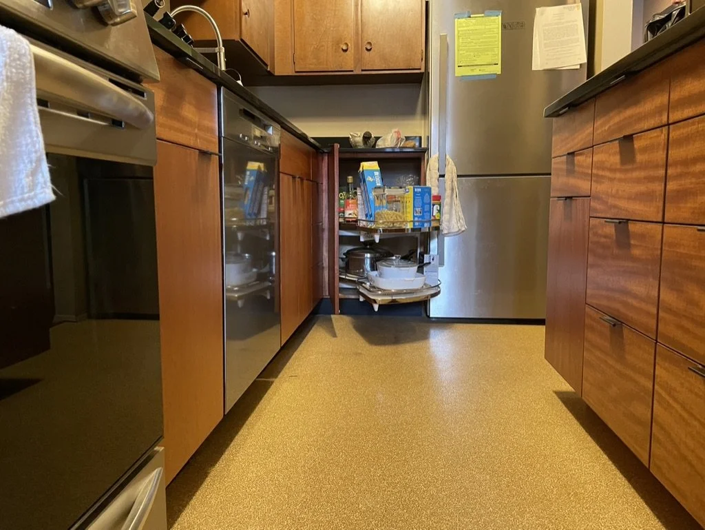 lower cabinets for a small kitchen in Capital Hill condominium made from khaya wood (African mahogany). corner cabinet has a pull out hardware for easy accessibility.
